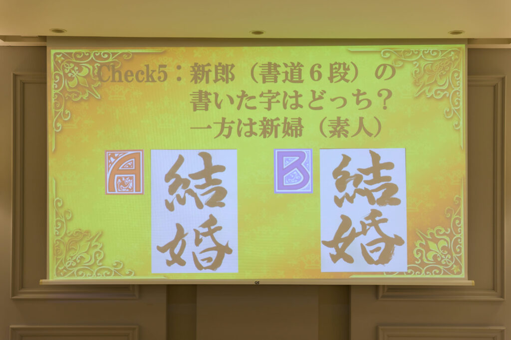 ⑤習字の問題、新郎さまの書いた字はどっち?