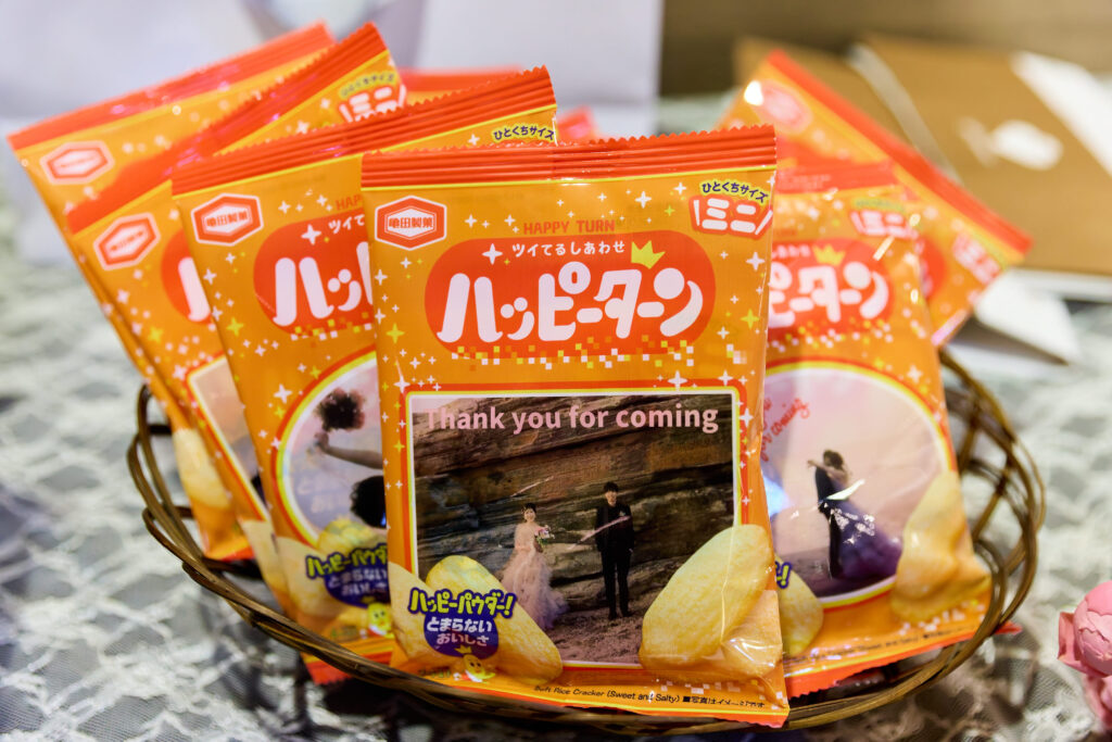 プチギフトにはオリジナルの写真が入ったハッピーターンと、
