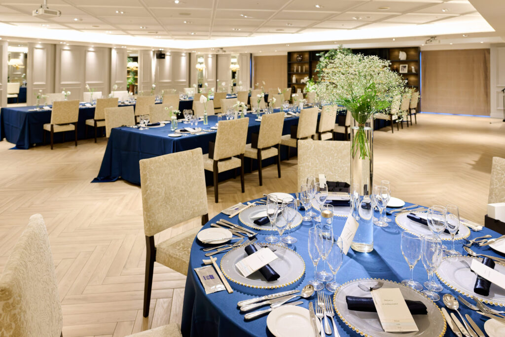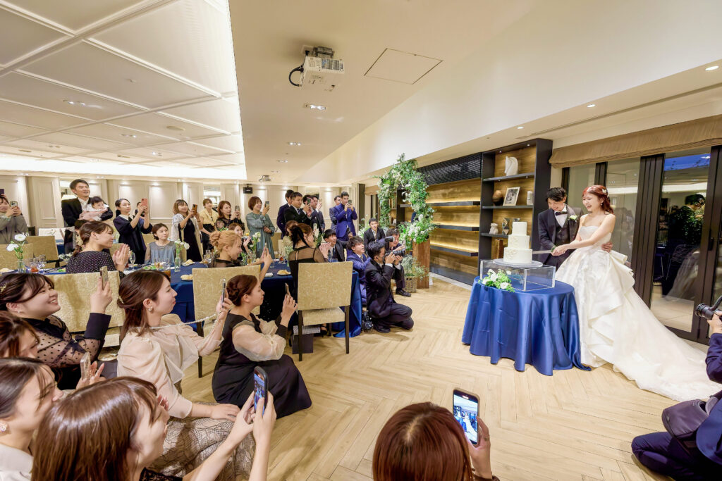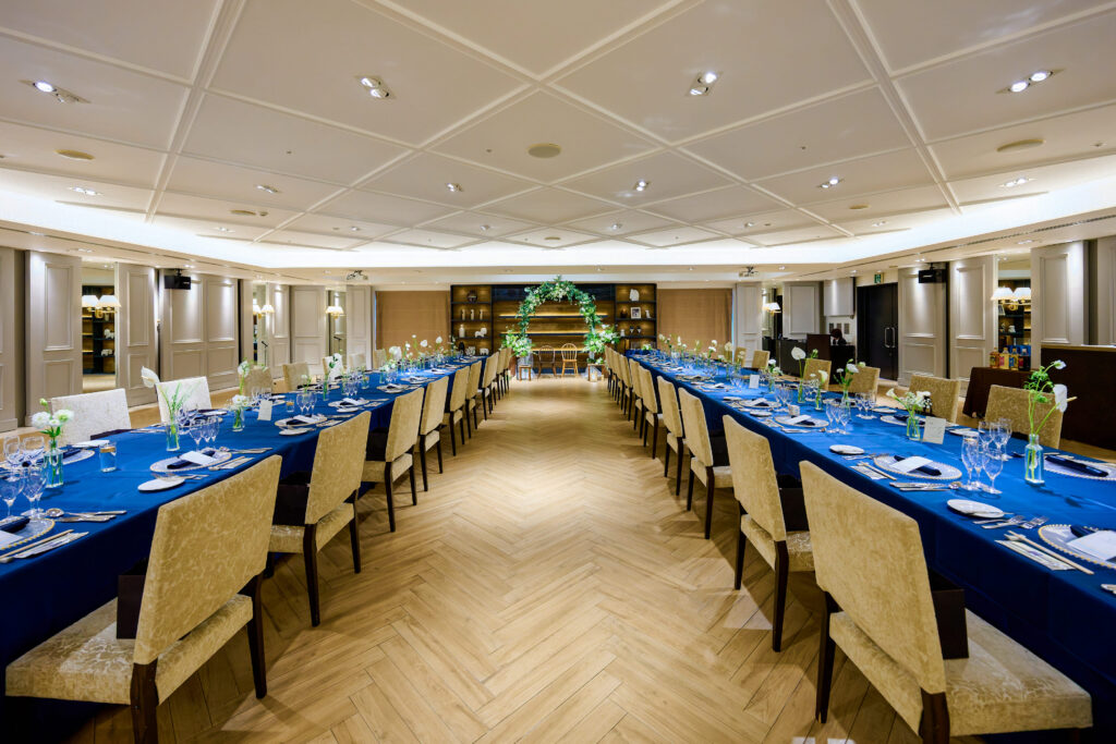 おふたりこだわりの会場コーディネートは、ネイビーと白を貴重とした上品な流しテーブルの会場コーディネート。