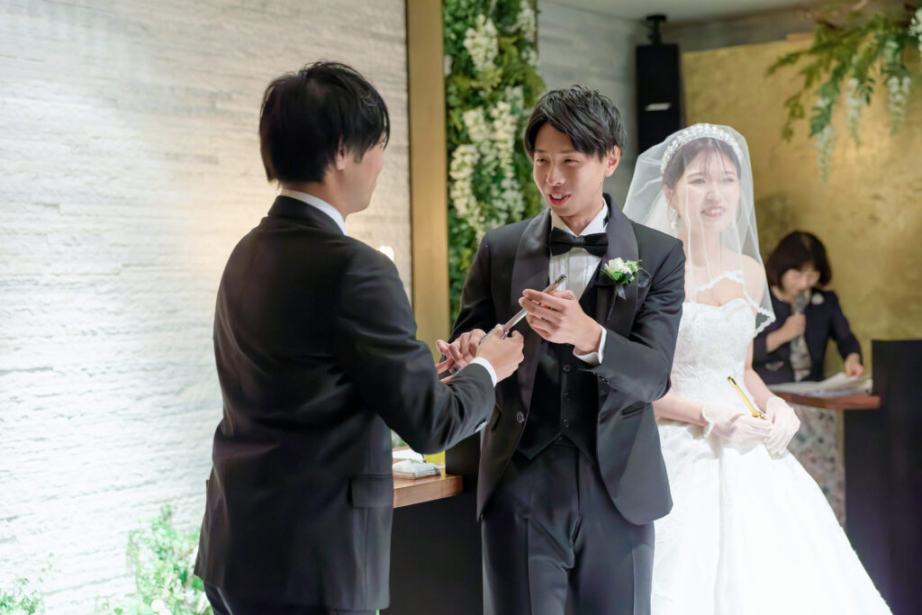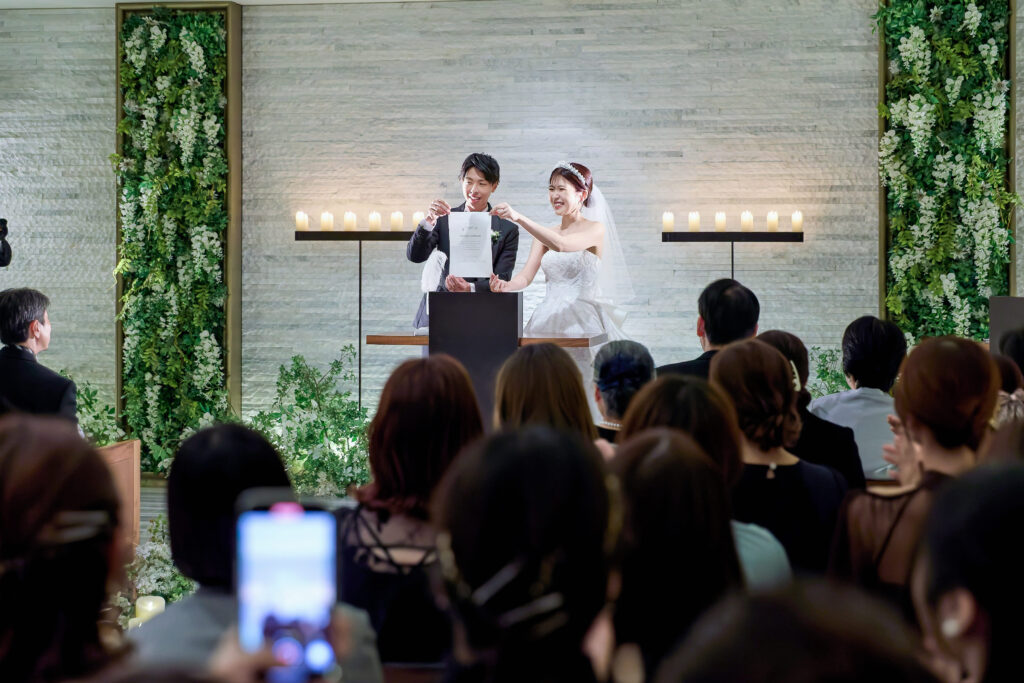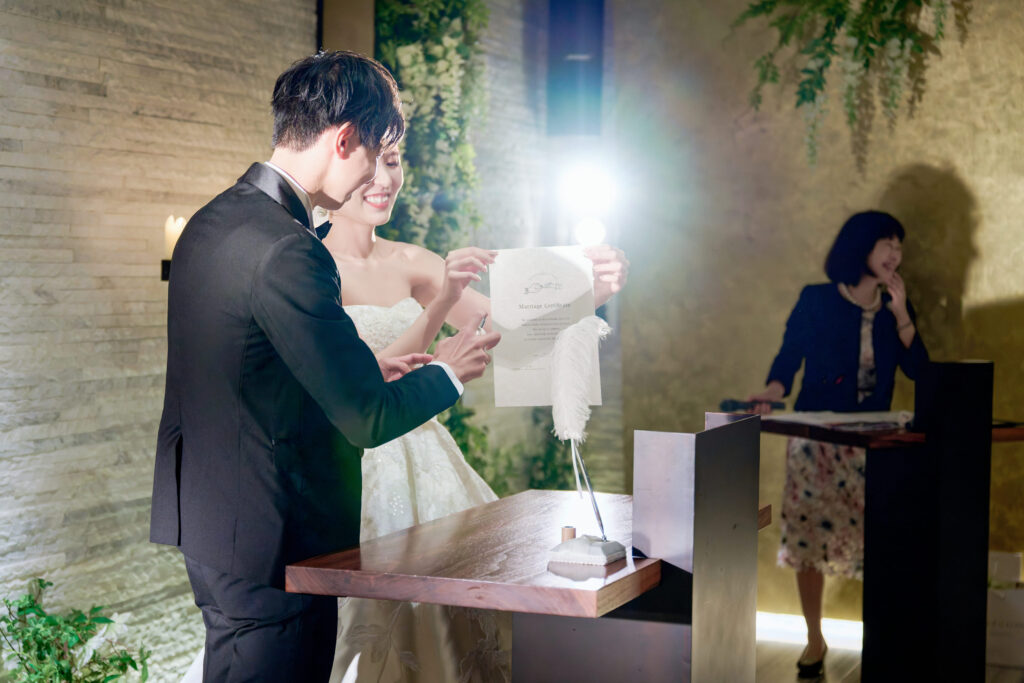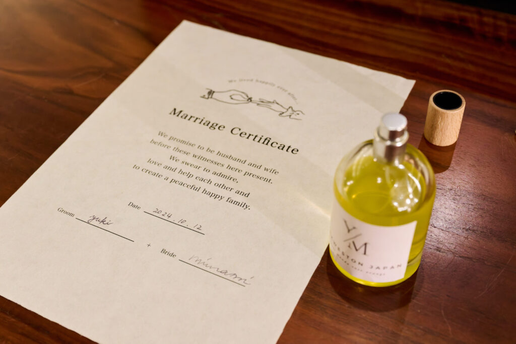 挙式で結婚証明書にふたりが署名し、最後に、出来上がった香水を吹き掛けて完成です!