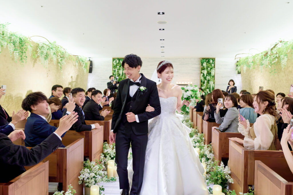 続々とゲストがチャペルへ集まり、いよいよ挙式がスタート。挙式はゲストの皆さまにご結婚を見届けていただく人前式です。