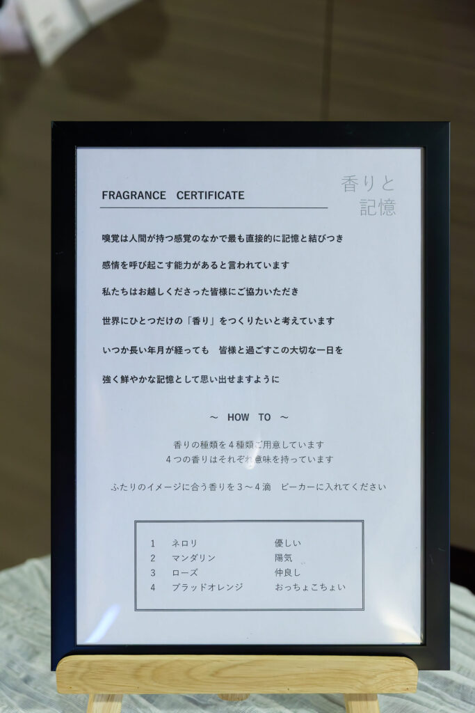 ちなみに、香りの選び方のお題は”新郎新婦ふたりのイメージに合う香り”