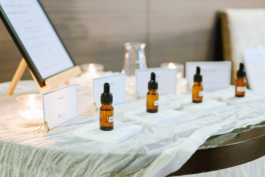 作り方は4つの精油を用意し、ウェルカムスペースで新郎ゲストには新郎をイメージ、新婦ゲストには新婦をイメージする香りを1つ選んでもらい、無水エタノールが入ったビーカーに垂らしてもらいます。